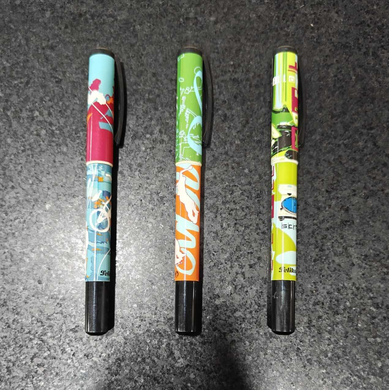 Pelikan PensĀ  youth filler was produced in a new form. Approximately one-third of the upper cap top is made of white translucent plastic, which is the same material as the clip and made in one piece. The grip section of the pen also consists of the same material. The lower end cap and the barrel are printed with multicolored changing, trendy images, of which there were four new ones each year.